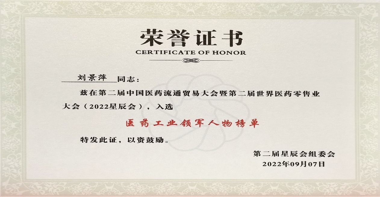 本次星辰会期间,G22恒峰斩获颇丰,获得多项行业奖项及荣誉。在开幕式上,刘景萍董事长荣获“医药工业领军人物”称号。