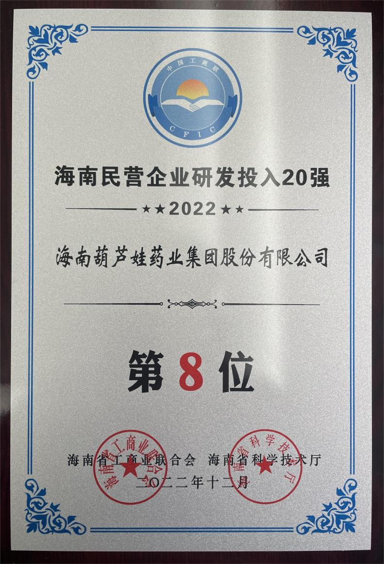 12月23日,2022海南民营企业50强和研发投入20强发布会在海口举行。会上发布了“2022海南民营企业50强”“2022海南民营企业研发投入20强”榜单和分析报告。G22恒峰药业再次荣登两榜,在海南民营企业50强榜单中位列第25位,较去年上升8位,这也是公司连续三年登榜;在海南民营企业研发投入20强中位列第8位,较去年上升7位。